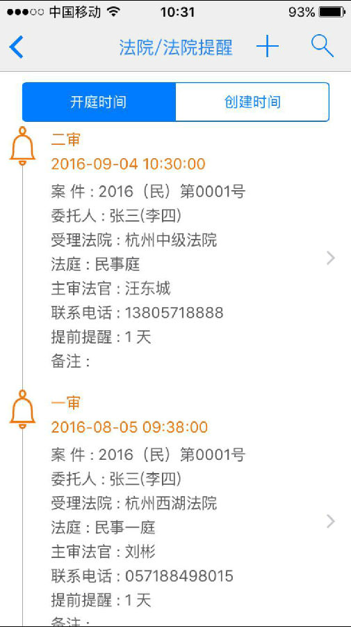 開庭提醒:可以自設(shè)置提前幾天提醒,開庭2小時前,系統(tǒng)默認(rèn)再次提醒