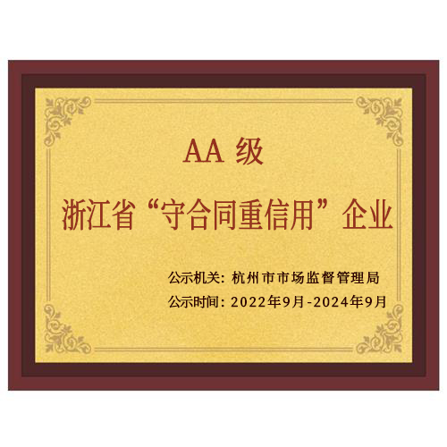 公司在2022年“守合同重信用”評比中,憑借良好的誠信經(jīng)營記錄和合同履約能力,經(jīng)過杭州市市場監(jiān)督管理局審核,榮獲浙江省AA級“守合同重信用”企業(yè)榮譽(yù)稱號。
