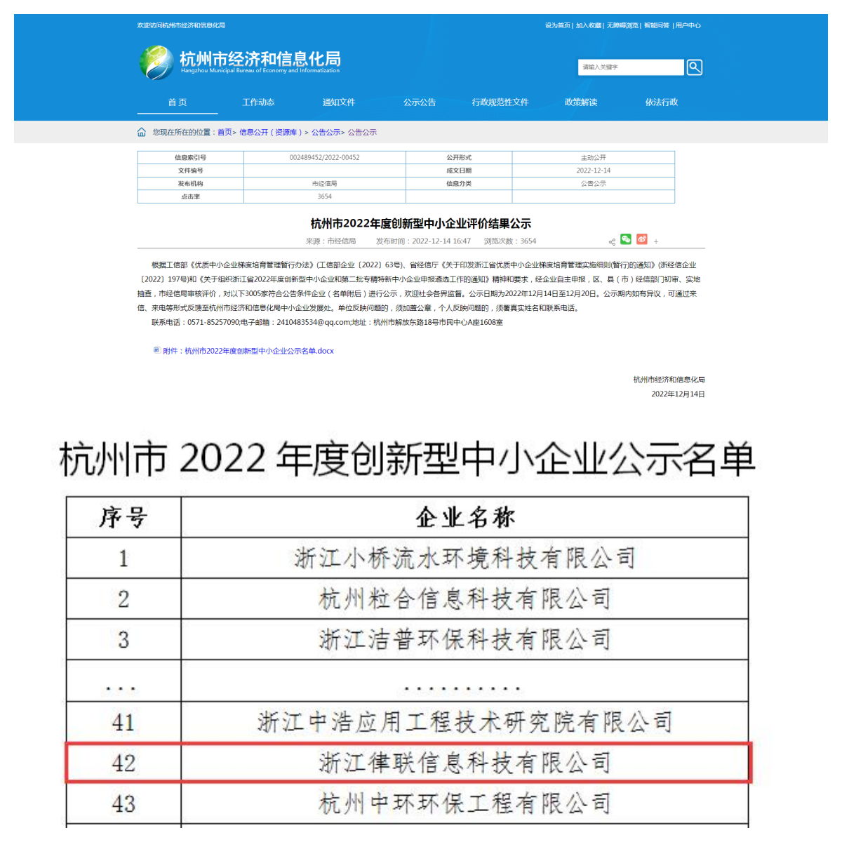 浙江省杭州市經(jīng)濟(jì)和信息化局公示“2022年創(chuàng)新型中小企業(yè)”名單,律聯(lián)科技公司被認(rèn)定為2022年度創(chuàng)新型中小企業(yè),是對公司在科技創(chuàng)新能力、核心自主知識產(chǎn)權(quán)、科技成果轉(zhuǎn)化能力、企業(yè)自主成長能力等方面的充分肯定。